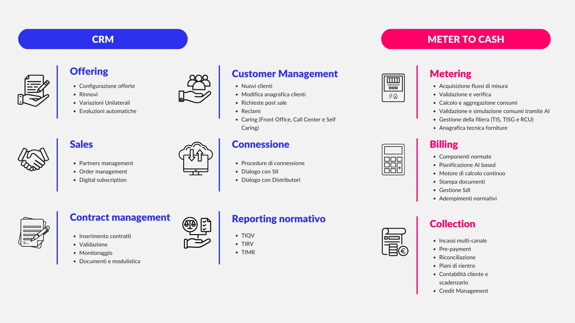 4UTILITY.Cloud permette di gestire tutte le peculiarità del mercato energetico mettendo a disposizione funzionalità sempre più evolute per gestire tutti i processi in carico agli operatori della vendita: dai processi core di CRM, Meter to Cash, connessione e reportistica normativa, fino a quelli che permettono di gestire i rapporti con tutti gli attori che intervengono nella filiera e tutti gli altri processi specifici del settore.