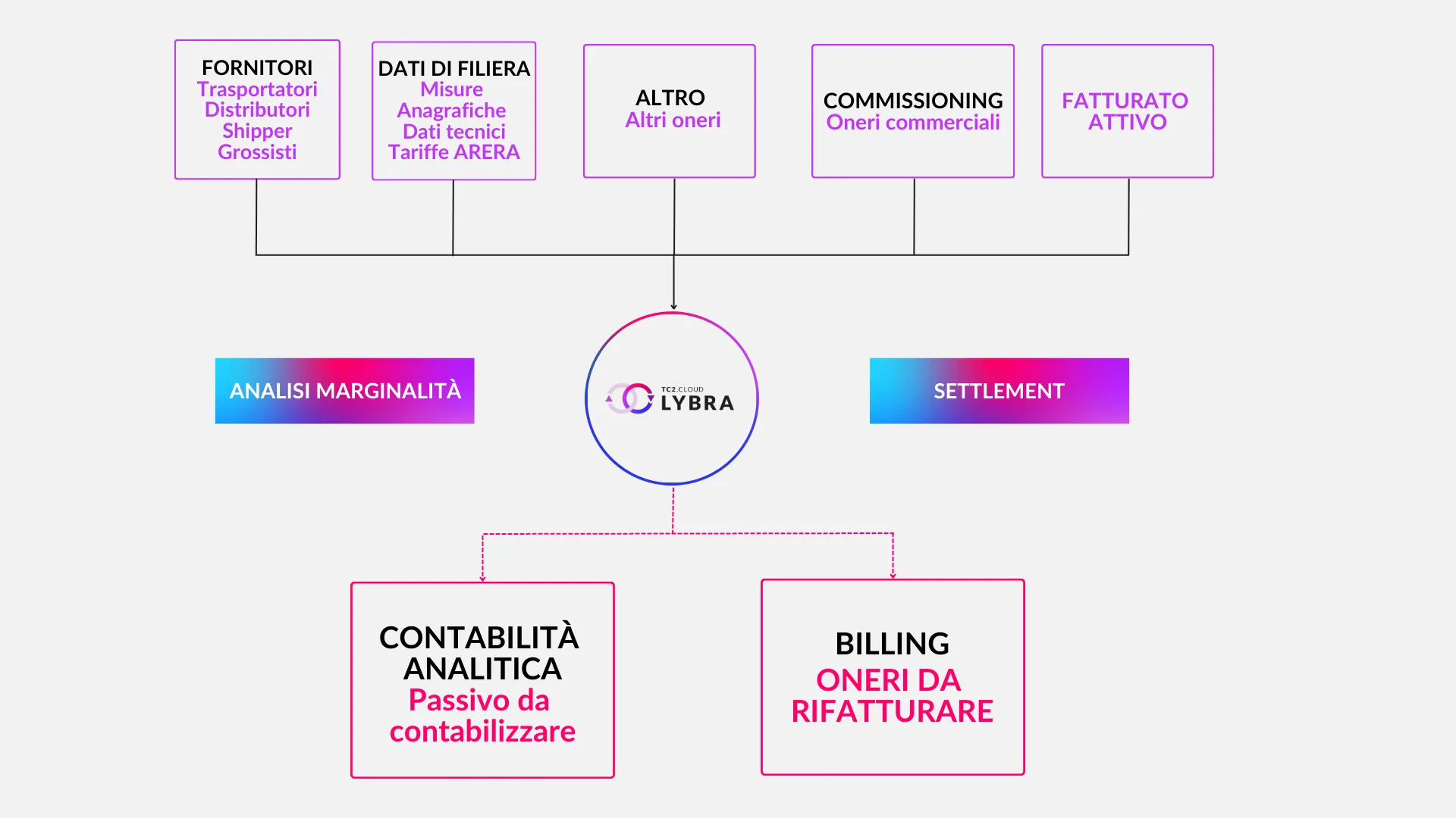 TC2.Cloud Lybra centralizza tutte le informazioni, numerose ed eterogenee, provenienti dai vari attori della filiera e le normalizza in modo da garantirne la coerenza e quindi la confrontabilità nei vari scenari di analisi.