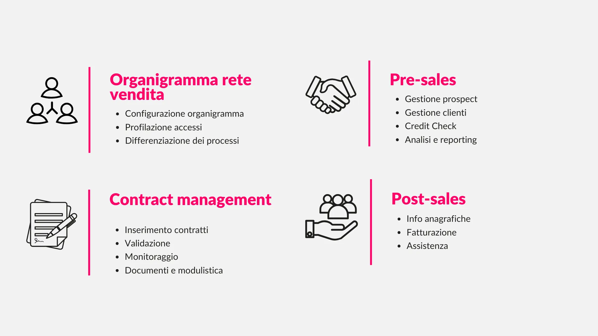L'obiettivo è quello di ottimizzare ed accentrare la gestione della rete vendita mettendo a disposizione dei partner strumenti dedicati che supportino i processi di pre-sales, di stipula contrattuale e le attività di post-sales.
