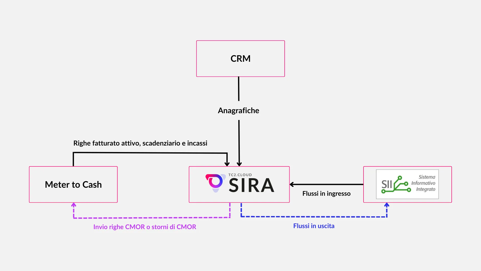 - Integrare, tramite Web API o tracciati, gli applicativi di CRM e di Meter to Cash per l'acquisizione dei dati anagrafici e di fatturazione e la trasmissione del corrispettivo Cmor al billing.